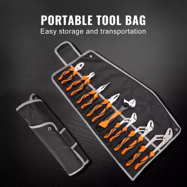 Ultra-Strong Construction: High-carbon steel with 42HRC hardness delivers maximum strength and reliability for heavy-duty use. Advanced Heat Treatment: Secondary heat treatment reinforces cutting edges and stress points for superior toughness and corrosion resistance. Comfort-Driven Design: Dual-color TPR grips provide exceptional comfort, stability, and slip-resistance. Precision Adjustability: Groove joint and slip joint pliers easily adapt to round, square, hexagonal, or flat objects for secure handling. Complete Tool Collection: Includes 12″, 10″, and 8″ groove joint pliers, 8″ linesman’s pliers, 8″ long nose pliers, 6″ slip joint pliers, 6″ diagonal cutter, and a 10″ adjustable wrench—plus a durable storage bag.