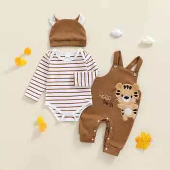 Infant Boy 3-Piece Striped Romper Set with Tiger Embroidered Overalls and Hat