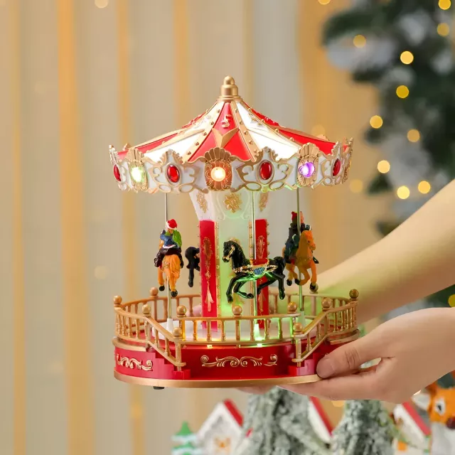 Turn any space into a festive wonderland with this charming rotating Christmas carousel. Designed with a classic Santa Claus theme and rich red details, this decoration captures the joy and nostalgia of the holiday season. As it slowly spins, it plays beautiful music and glows with colorful LED lights, creating a warm and dreamy Christmas atmosphere your whole family will love.