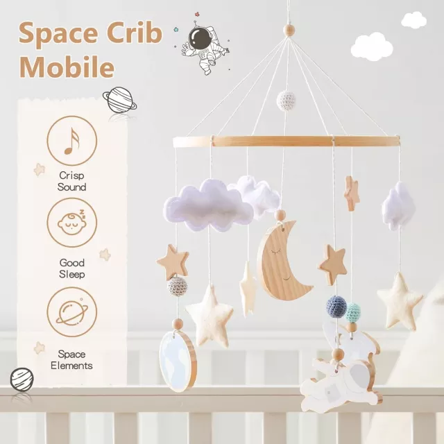Create a calming, magical atmosphere in your baby’s nursery with this enchanting wooden crib mobile holder and rattle set. Designed with soft clouds, gentle moons, twinkling stars, and an adorable bear and astronaut theme, it turns any crib into a cozy dreamland. The warm earthy tones make it a beautiful fit for boys and girls, blending easily with modern, rustic, or classic nursery décor.